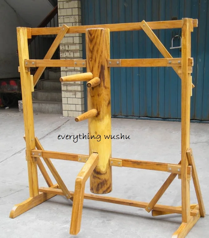 This is a kind of wooden dummy called framed or compact wooden dummy which is standing up by a functional frame which is a mixed style between freestanding dummy.