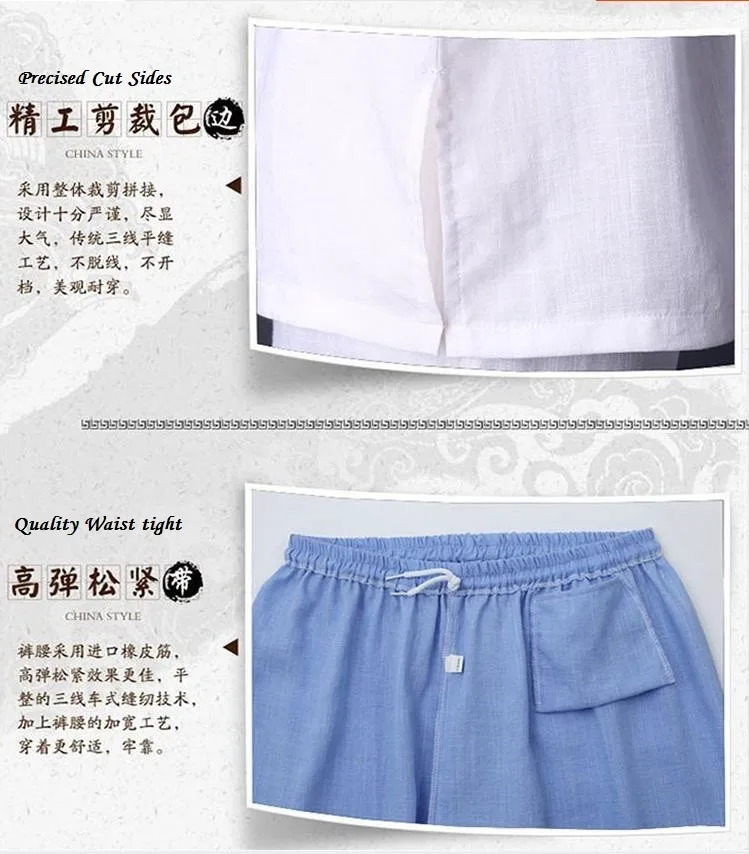 Description: The material of Jacket and Pants are made from Cotton& Linen is a textile made from the fibers of the flax plant. Linen is laborious to manufacture, but the fiber is very absorbent and garments made of linen are valued for their exceptional coolness and freshness in hot weather.